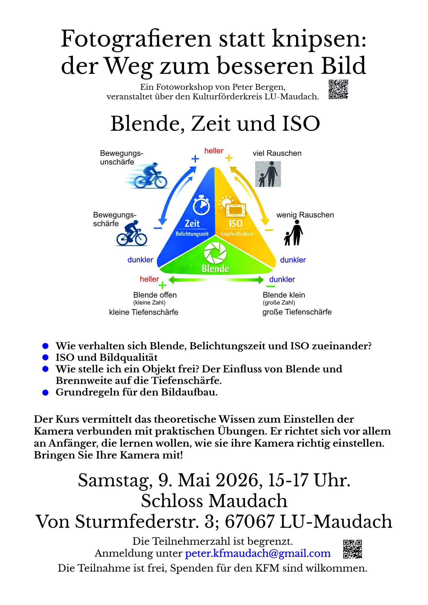 | 09.05. | 15 Uhr | Fotoworkshop mit Peter Bergen: Der Weg zum Besseren Bild | Maudacher Schloss | KFM |