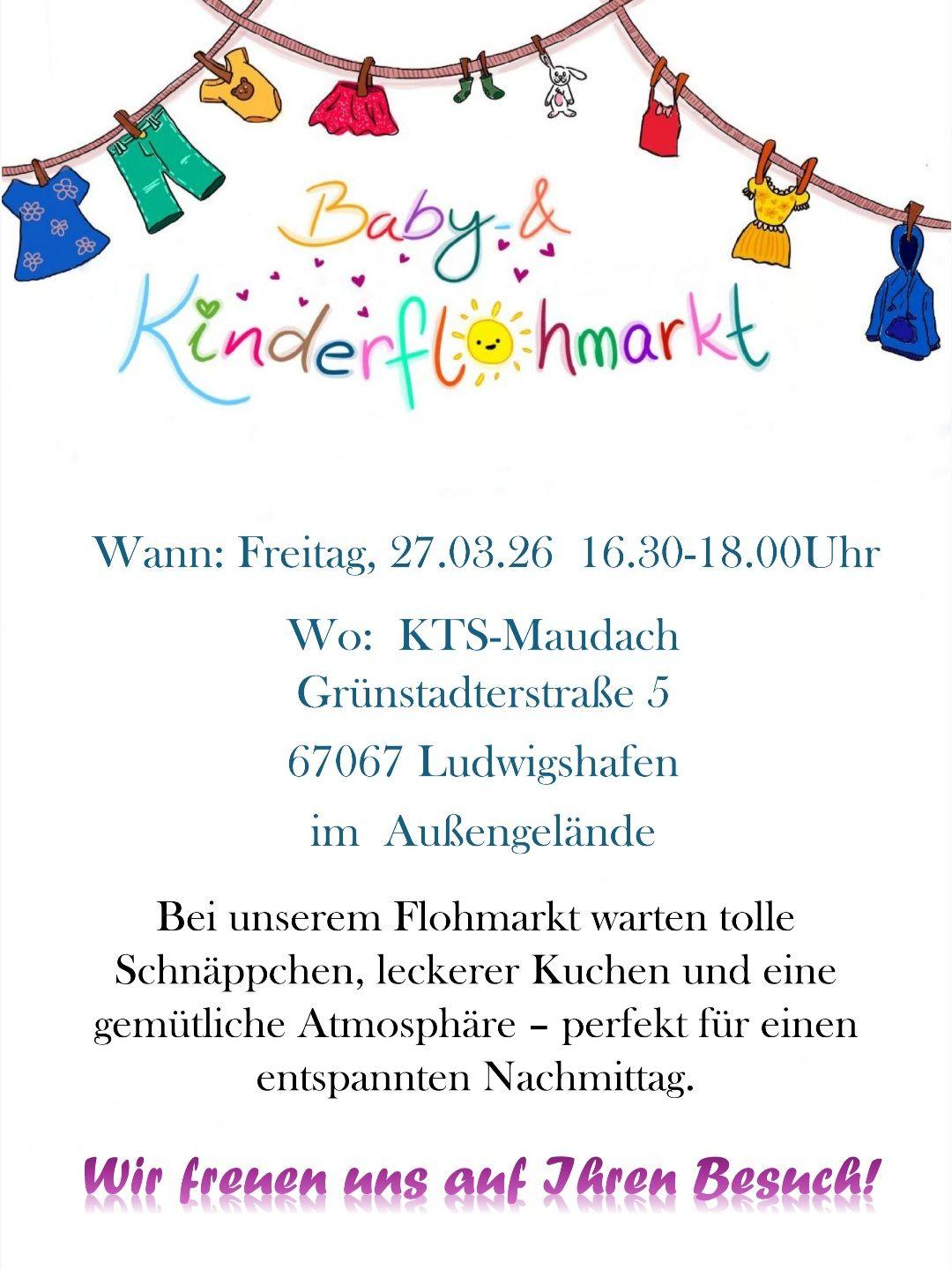 | 27.03. | 16:30-18 Uhr | Baby- und Kinderflohmarkt | Grünstadter Str. 5 | KTS-Maudach |