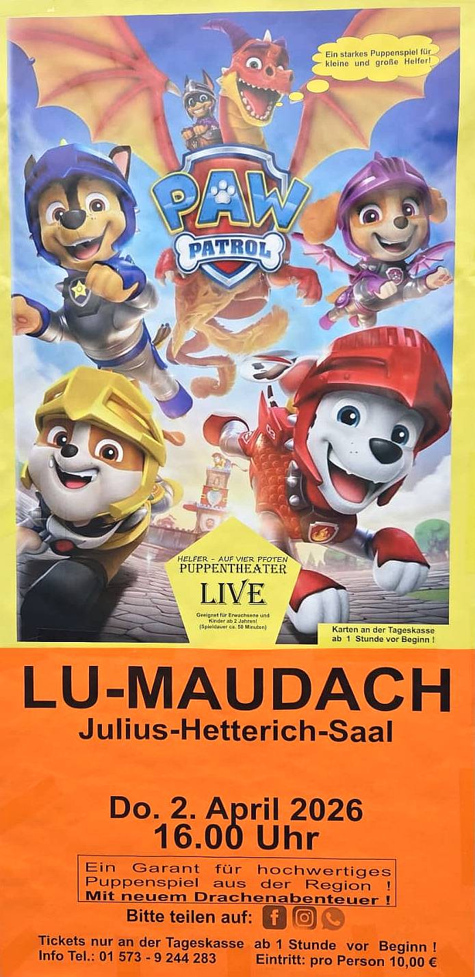 | 02.04. | 16 Uhr | Theatervorführung "Paw Patrol". Nur Tageskasse, €10 p.P., Infos unter 01573-9244283. | Julius-Hetterich-Saal | Pajazzo's Puppentheater |