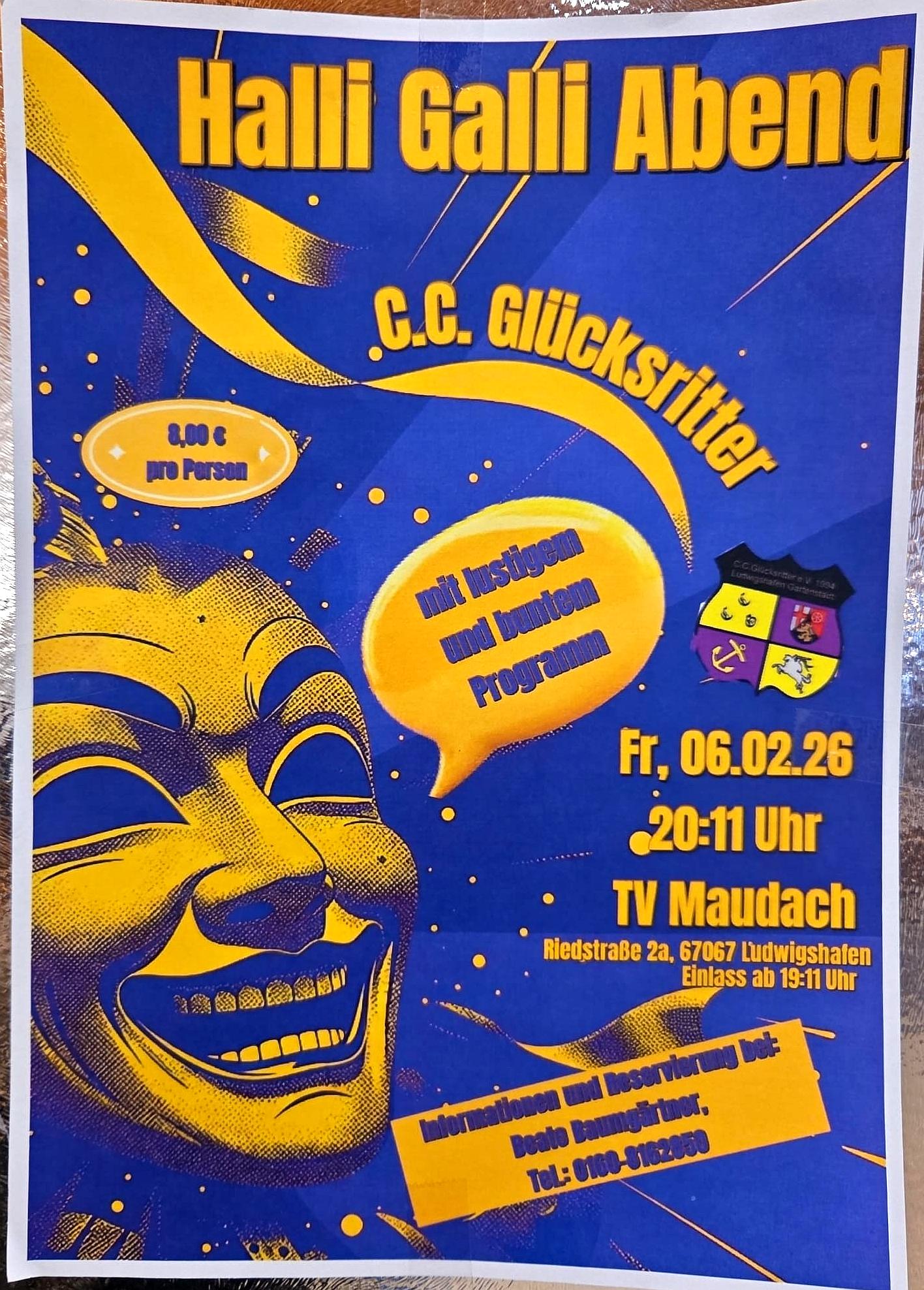 | 06.02. | 20:11 Uhr | Halli Galli Abend der Glücksritter | Gaststätte TVM | C.C. Glücksritter |